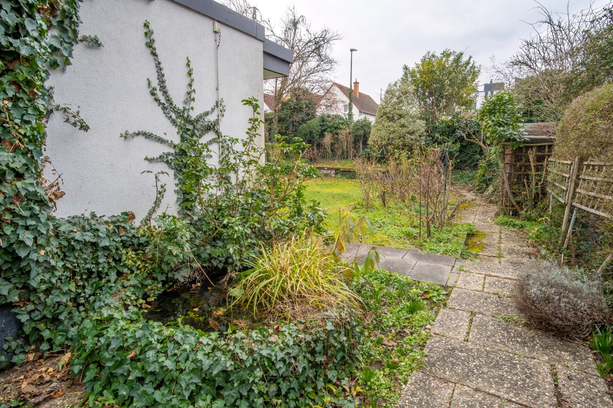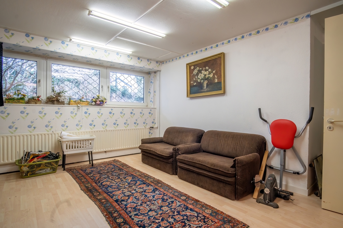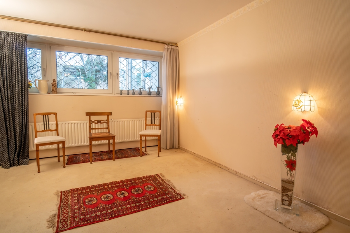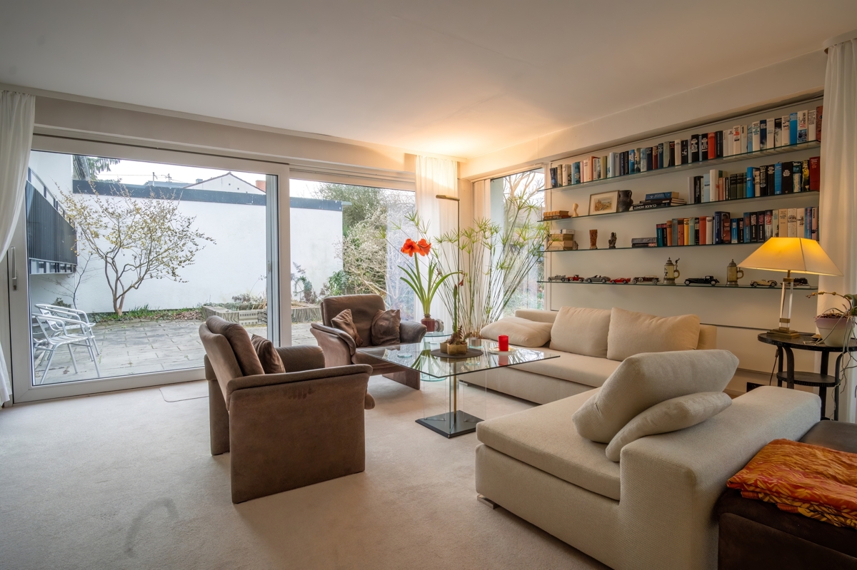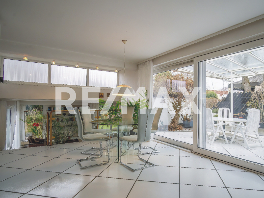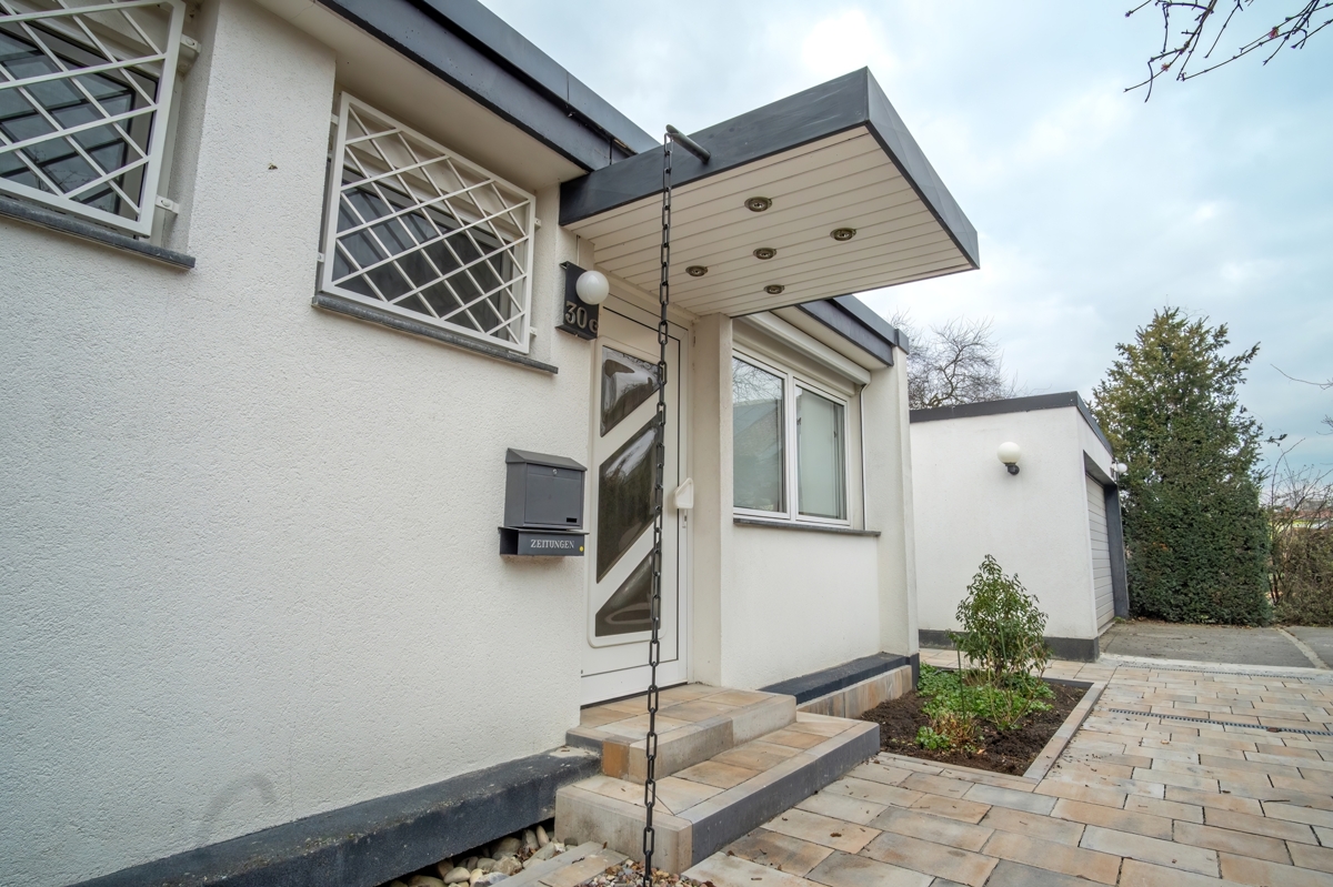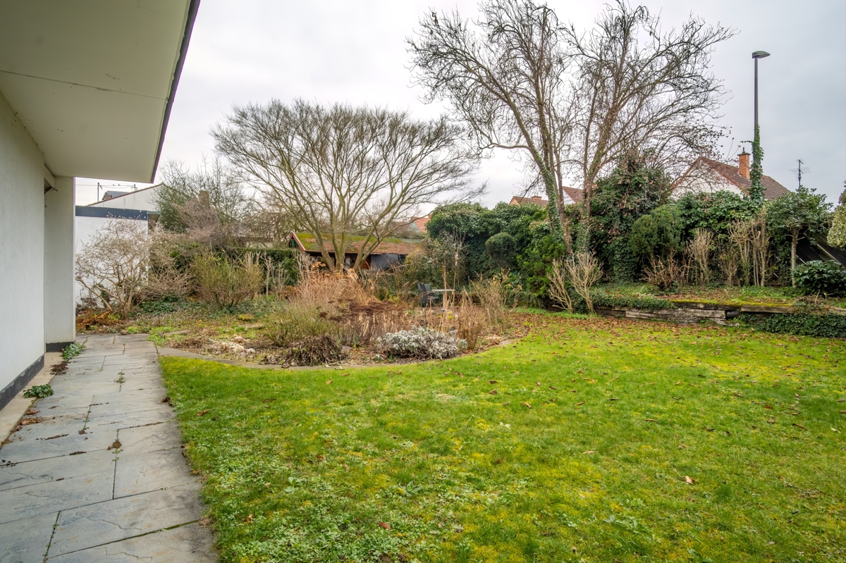 Auf einem Grundstück von ca. 659 m² wurde dieser Familienfreundlicher Winkel-Bungalow im Jahr 1963 mit einem besonderen Design massiv gebaut.Die Wohnfläche von ca. 160 m² verteilt sich auf das Erdgeschoss, einer versetzten Ebene mit Zugang zum Garten und das Untergeschoss.