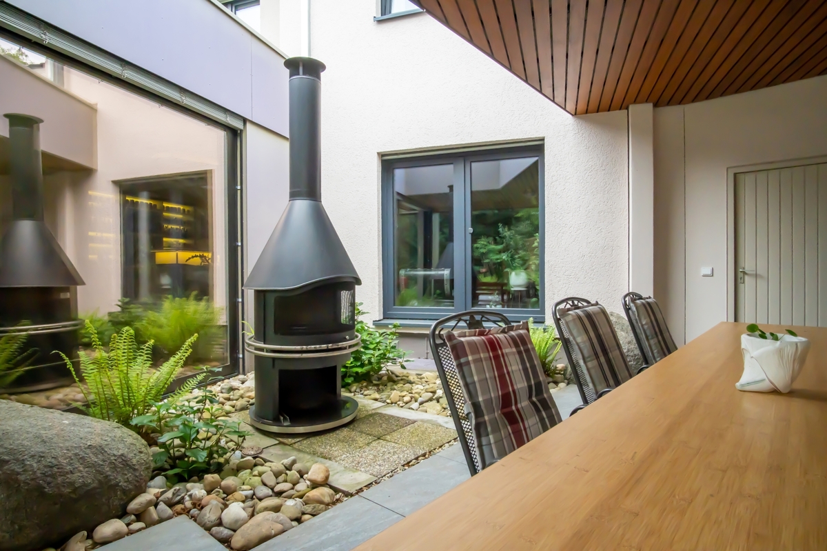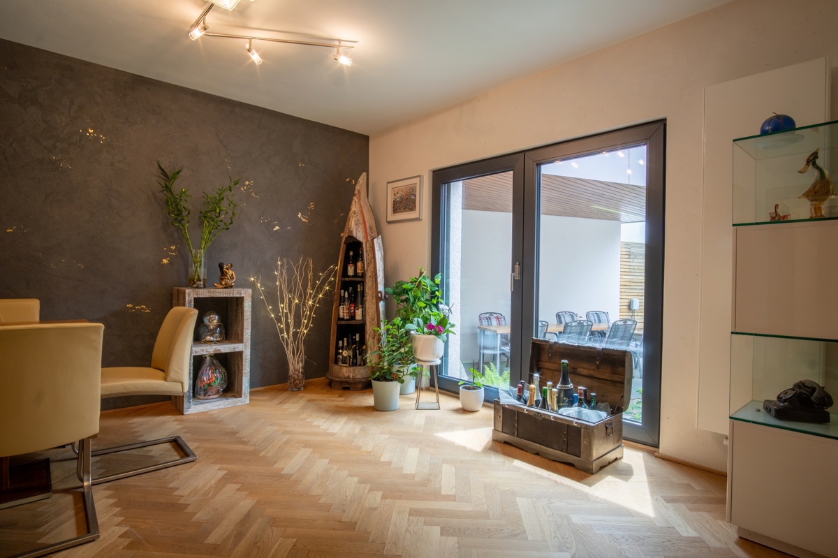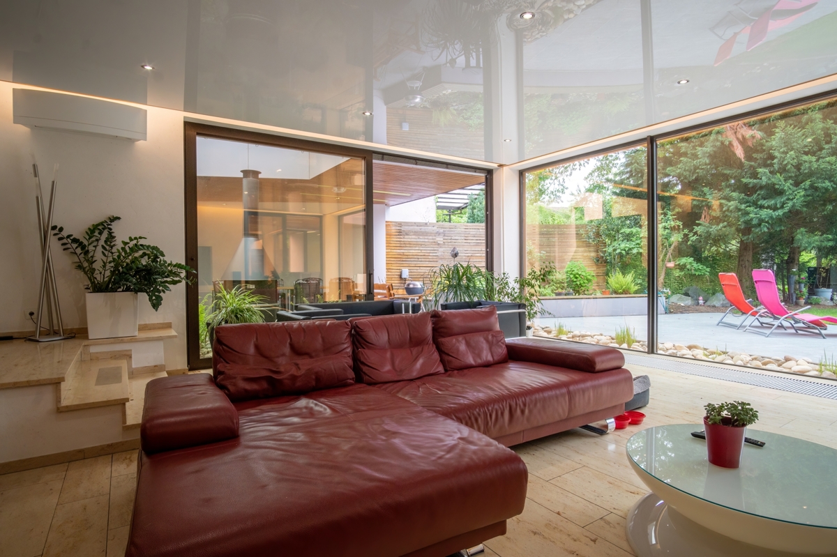 Mit einer großzügigen Wohnfläche von ca. 220 m², verteilt auf zwei Etagen, bietet dieses Anwesen ein unvergleichliches Wohnambiente. Bereits beim Betreten der Villa über den weitläufigen und lichtdurchfluteten Eingangsbereich werden Sie von einer außergewöhnlichen Atmosphäre empfangen. Das Erdgeschoss beeindruckt mit einem offenen und hellen Wohnzimmer, dessen bodentiefe Fenster einen atemberaubenden Blick in den liebevoll gestalteten Garten freigeben. Dieser grüne Rückzugsort besticht durch einen großzügigen Koi-Teich, der Ruhe und Eleganz ausstrahlt.