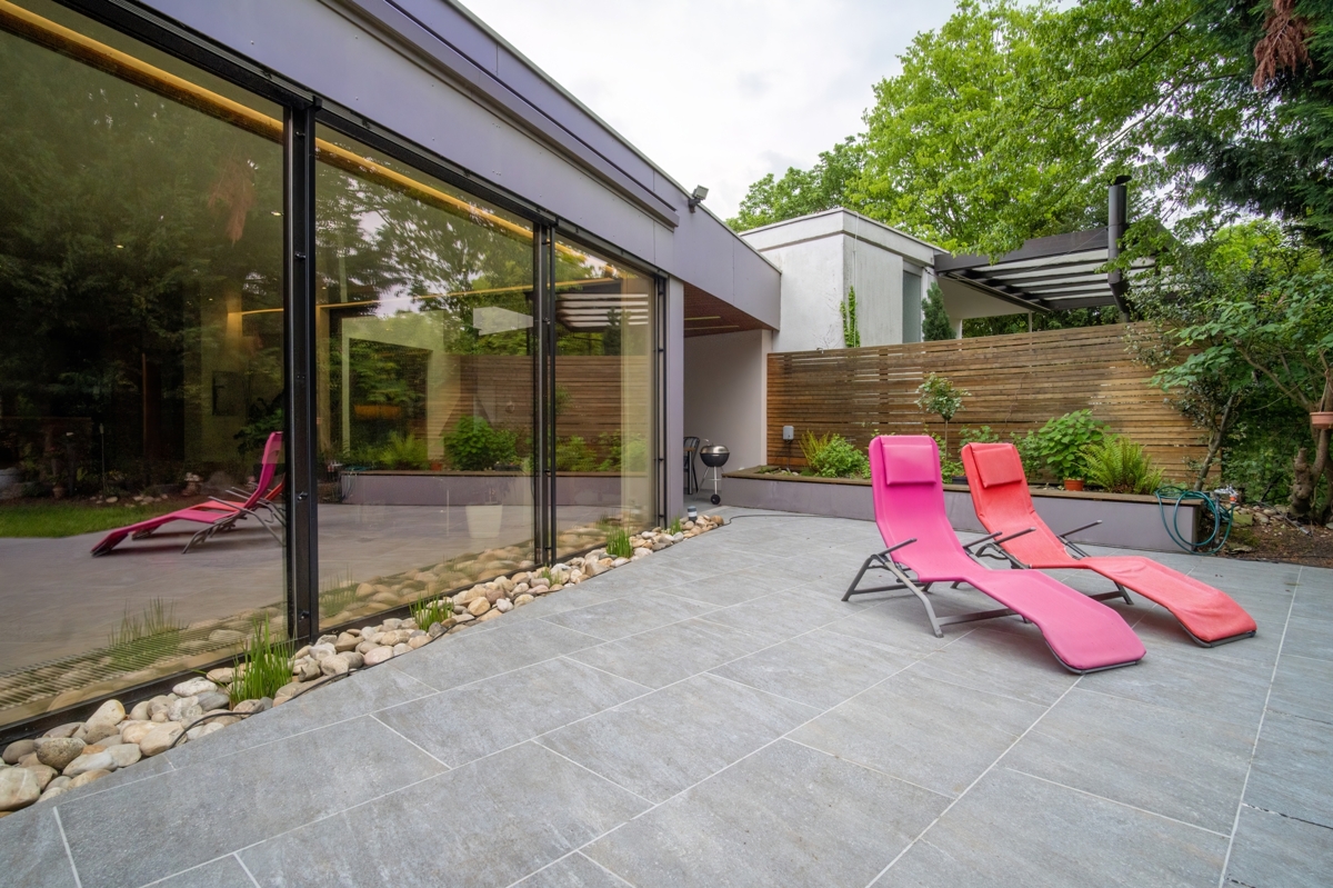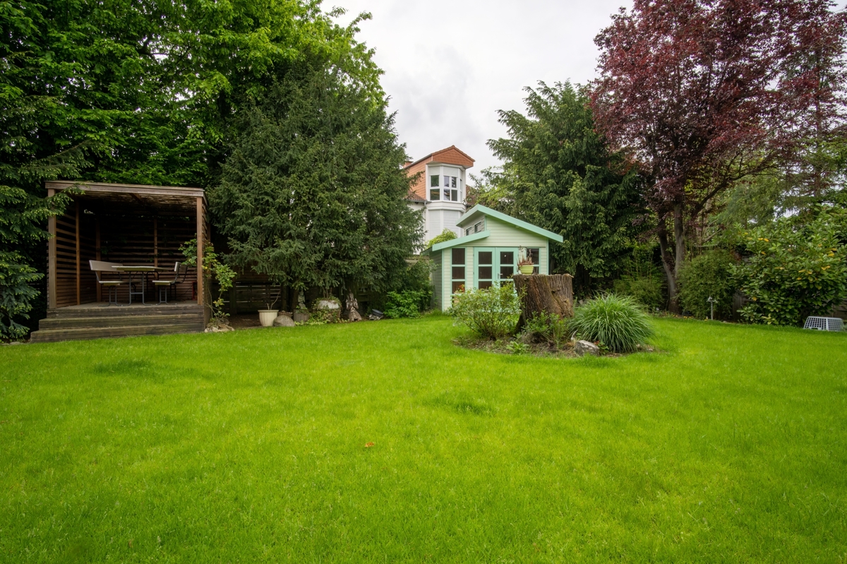 Diese besondere Villa befindet sich in einer sehr ruhigen Wohngegend, geprägt von freistehenden Ein- bis Dreifamilienhäusern.