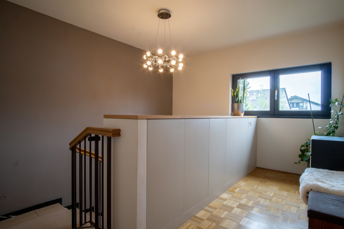 Das Obergeschoss überzeugt durch eine durchdachte Raumaufteilung und hochwertigen Komfort. Zwei helle und gut geschnittene Kinderzimmer bieten Ihren Liebsten ausreichend Platz zum Spielen und Lernen. Das Elternschlafzimmer überzeugt mit einem direkten Zugang zu einem stilvollen Ankleidezimmer, das nicht nur funktional ist, sondern auch jeden Wunsch nach Luxus erfüllt. Das großzügige Badezimmer ist ein weiteres Highlight: Eine begehbare Dusche, eine freistehende Badewanne und ein Tageslichtfenster schaffen eine entspannte Wohlfiühlatmosphäre.