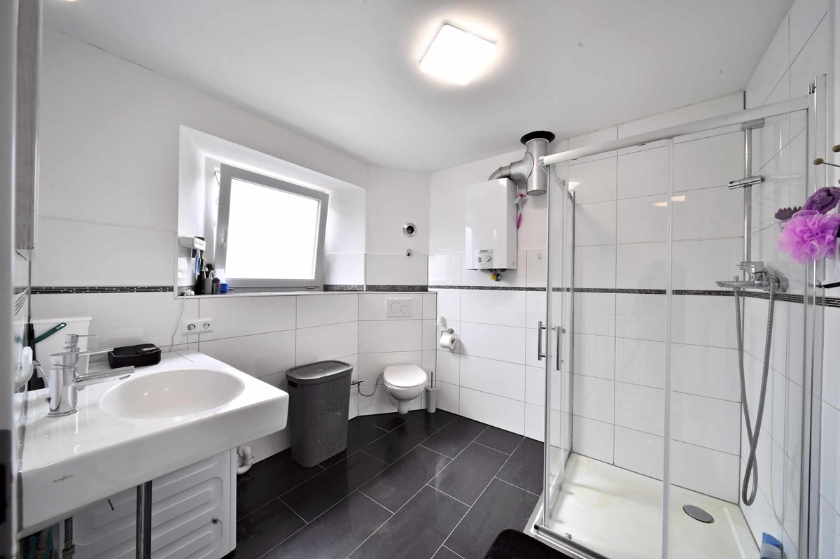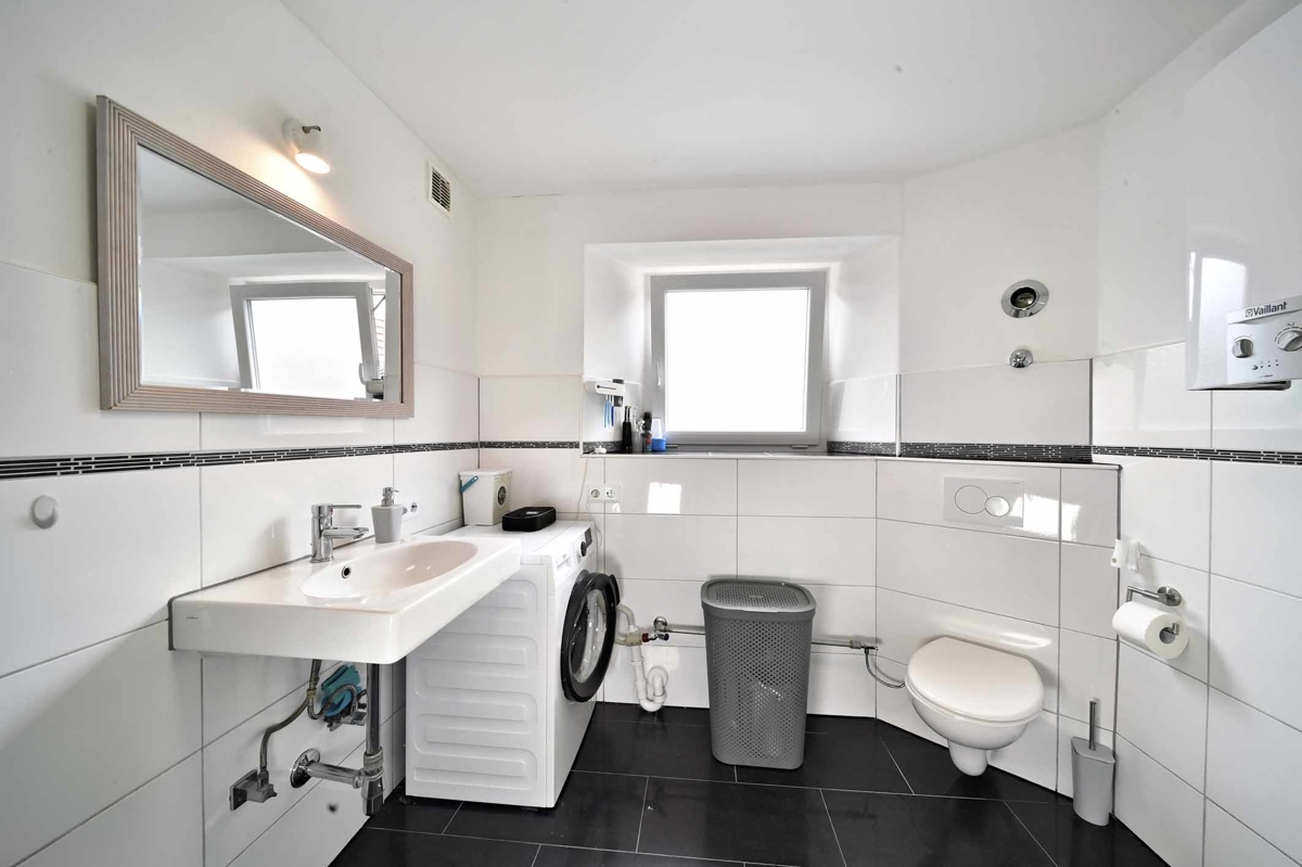 Das Tageslichtbadezimmer ist modern gestaltet und verfügt über eine Dusche, Waschbecken und WC, auch die Waschmaschine findet hier ihren Platz.