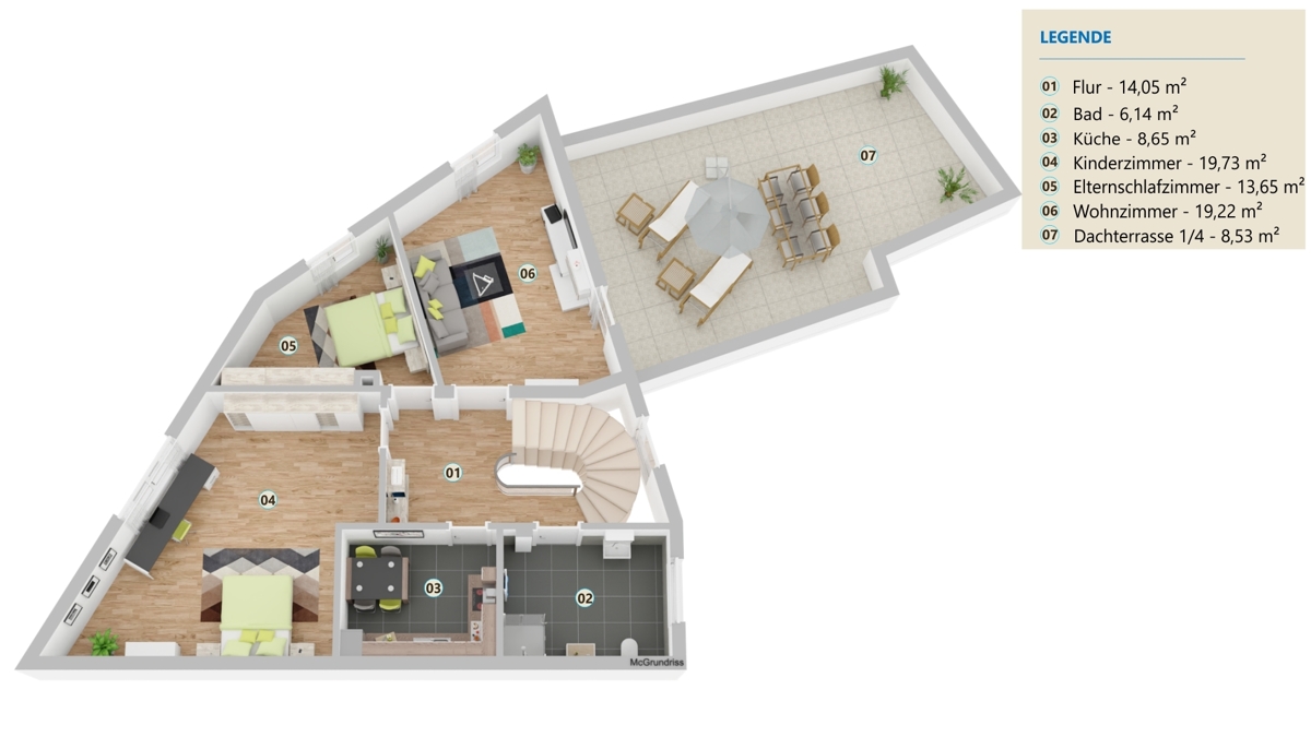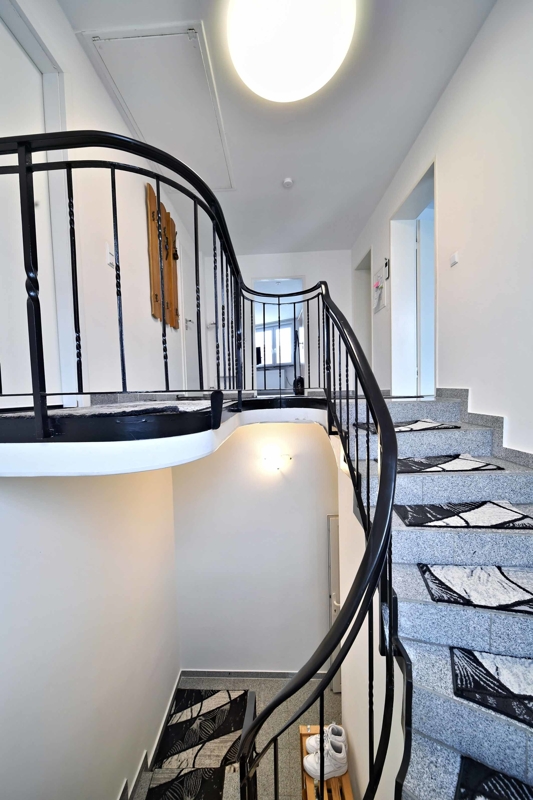 Beim Betreten der Wohnung gelangen Sie in eine kleine Diele, mit der Möglichkeit, Ihre Garderobe und einen Schuhschrank unterzubringen. Über die Treppe kommen Sie in den geräumigen Flur und zum einladenden Wohnbereich. Das große Fenster im Wohnzimmer sorgt für eine helle Atmosphäre und bietet den Zugang auf die große Dachterrasse.
