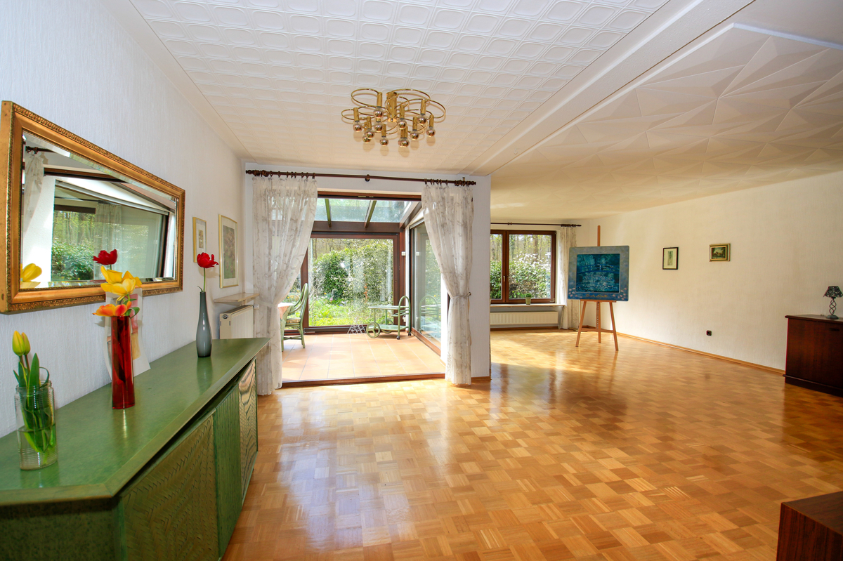 Auf dieser Ebene befindet das lichtdurchflutete Wohnzimmer mit großen Fensterfronten und einem nachträglich entstandenen, traumhaften Wintergarten.