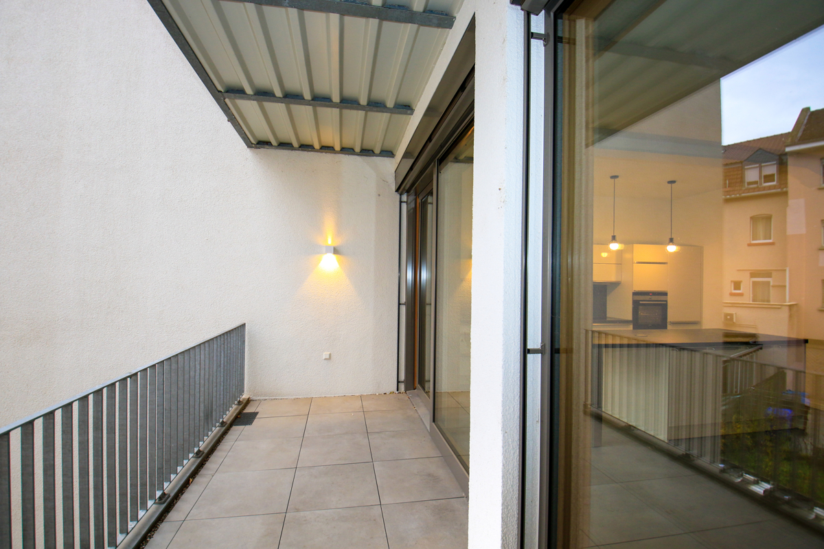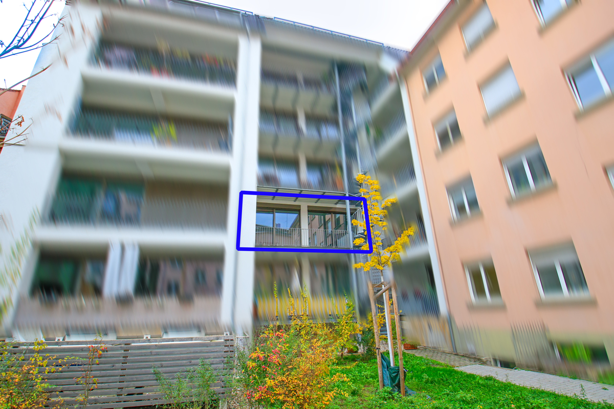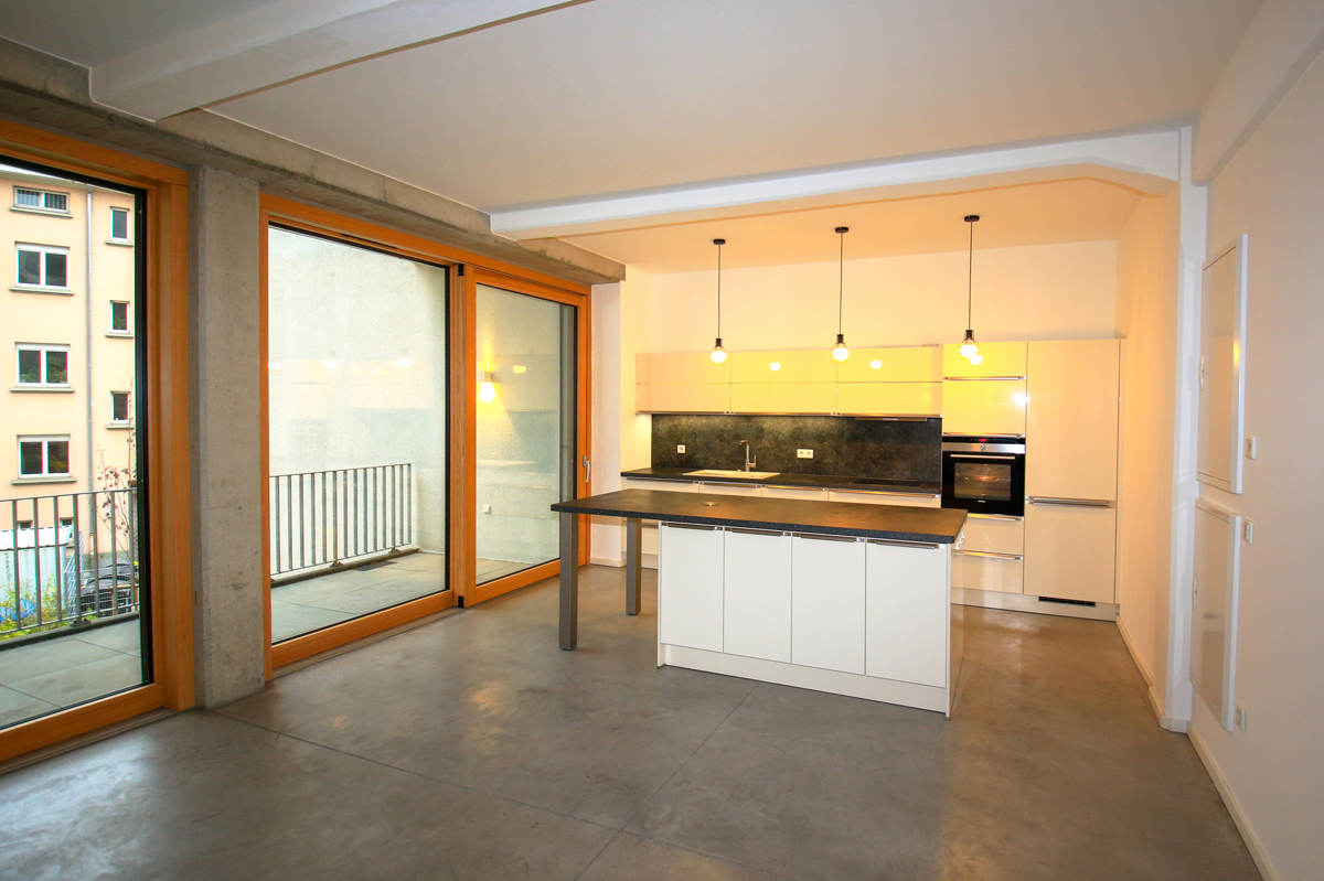 Der Wohn-Ess-Bereich sowie der offene Küchenbereich sind zum hellen Innenhof ausgerichtet und öffnen sich durch große Fenster zum Balkon, der ausreichend Platz für Grillabende mit Gästen oder zum Entspannen bietet.