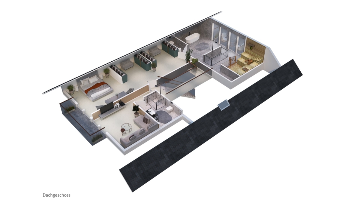 Das Elternschlafzimmer im Dachgeschoss bietet einen privaten Zugang zum Balkon sowie ein hochwertiges Badezimmer mit Himmelwand und Doppelwaschbecken. Das Masterbad ist zusätzlich mit einer Sauna ausgestattet, die für wohltuende Entspannung sorgt.