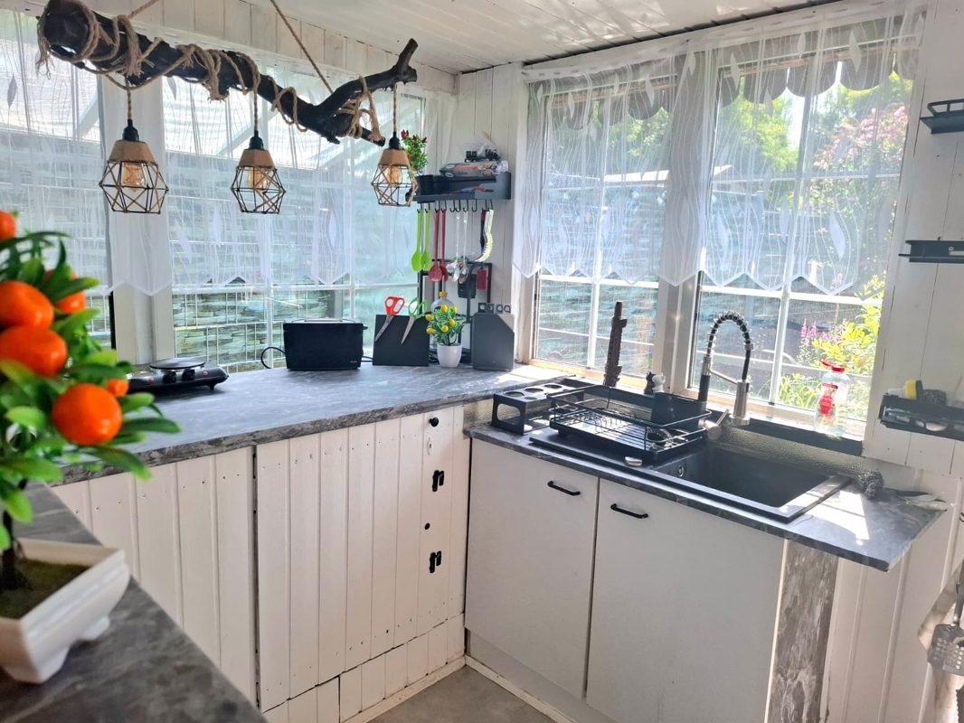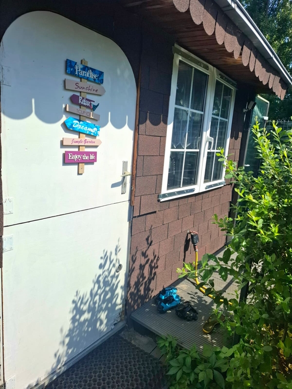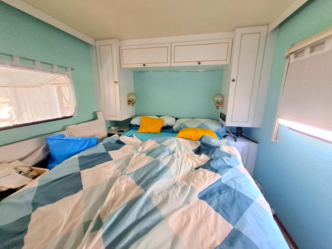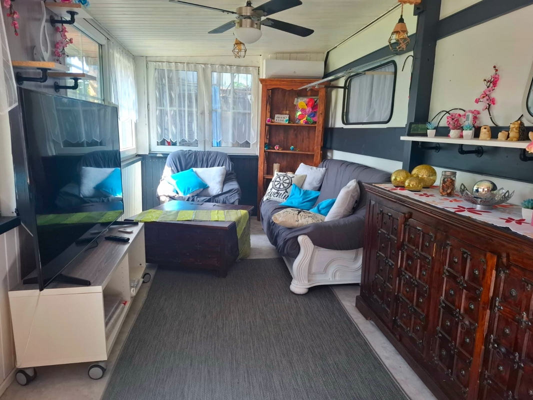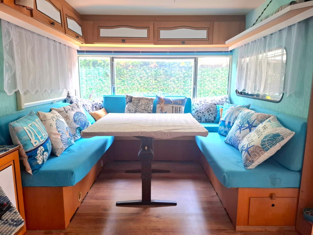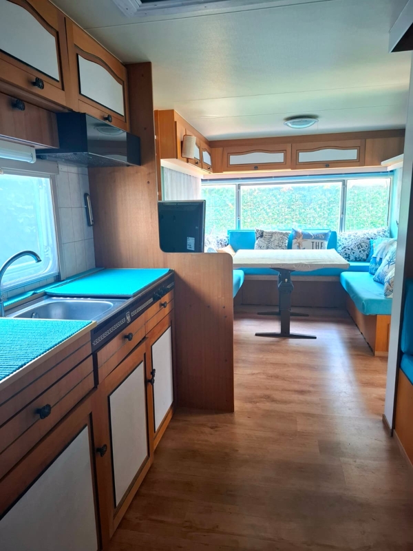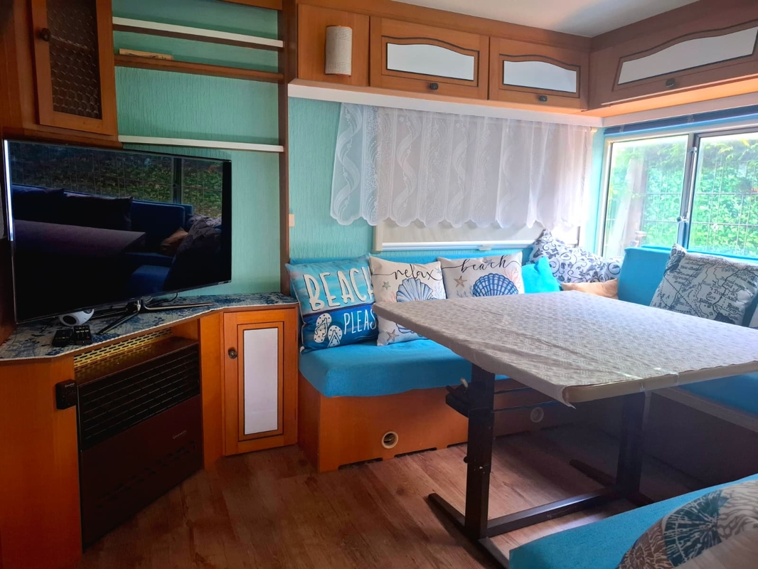 Im Mittelpunkt steht ein gepflegter Wohnwagen mit kleinem Bad, gemütlicher Sitzecke (neu bezogen, mit Schlaffunktion), Schlafzimmer mit Flachbild-TV und praktischer Küche. Ergänzt wird er durch einen geräumigen Vorbau mit einer stilvollen Küche. Davor lädt ein hochwertiger Pavillon zum Verweilen ein, mehrere gemütliche Sitzecken und bequeme Liegen laden zum Sonnen oder entspannten Lesen ein, während der Grillplatz mit Feuerstelle perfekte Abende in geselliger Runde garantiert.