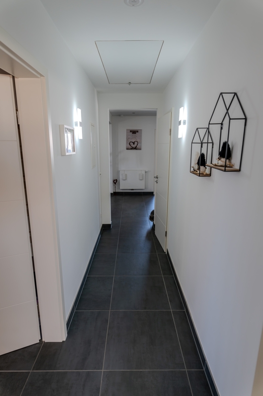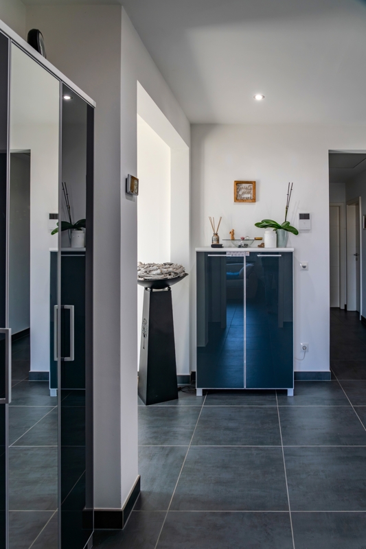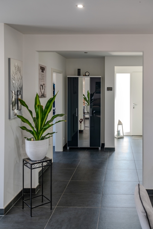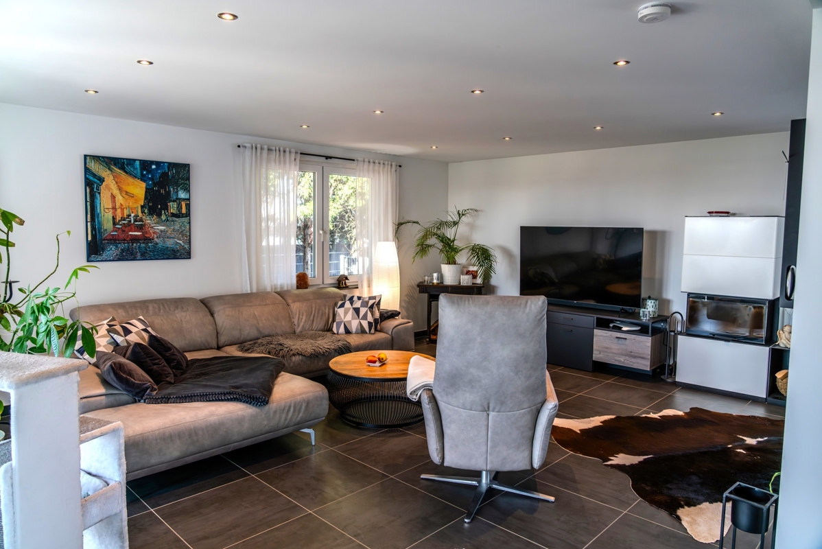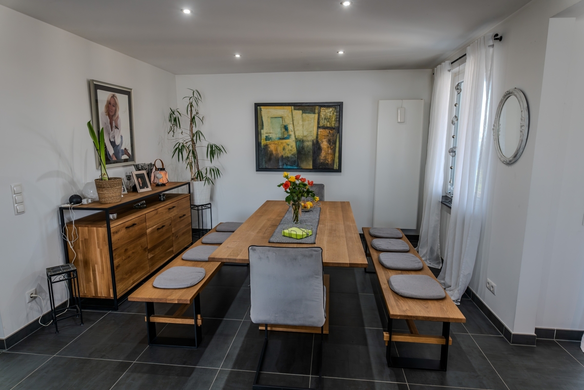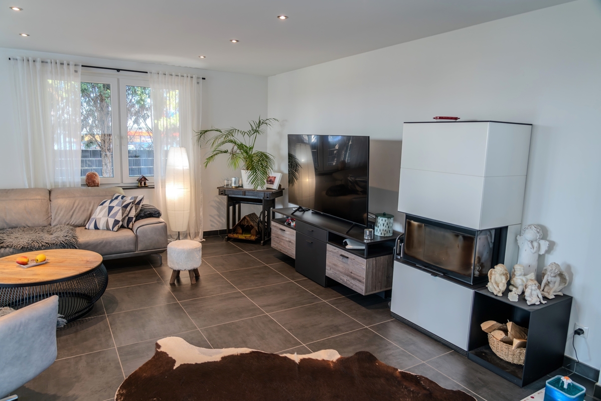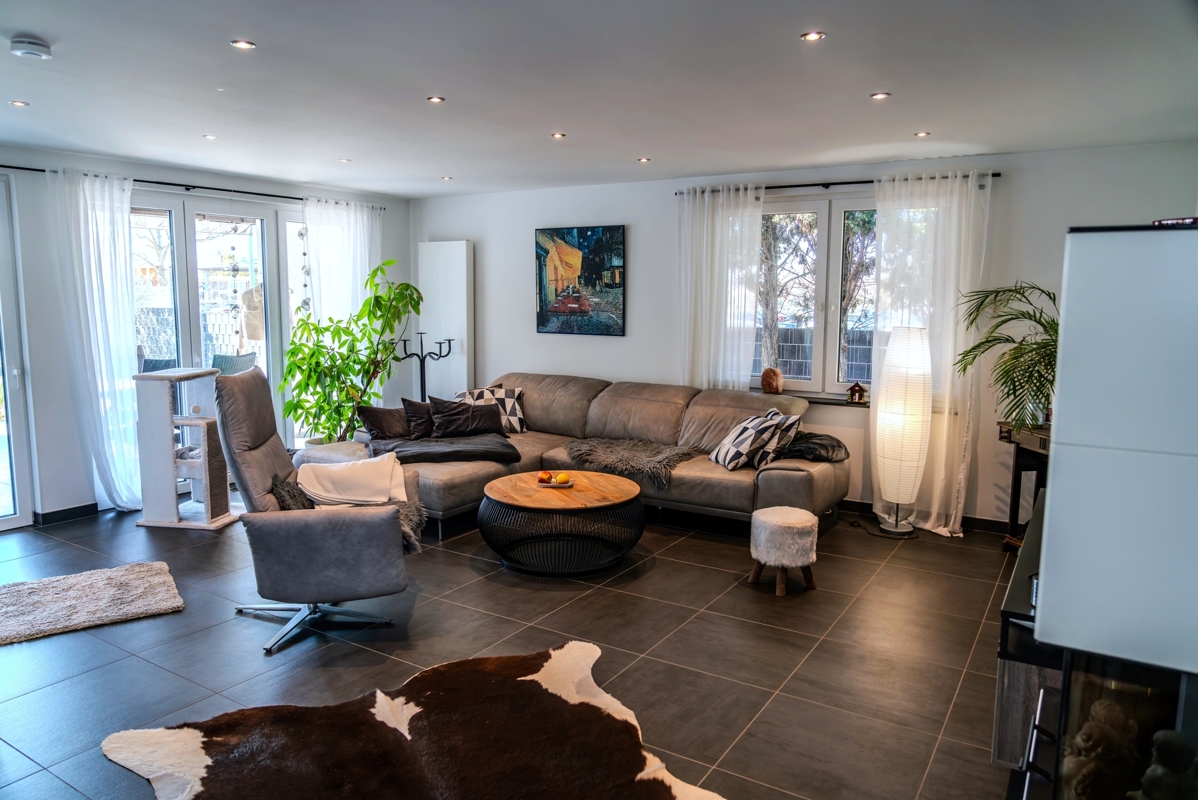 Ein hochwertiger Holzkamin setzt stilvolle Akzente und sorgt für eine behagliche Wärme an kühlen Tagen. Die edlen, großformatigen Bodenfliesen verleihen den Räumen eine zeitlose Eleganz, während die moderne Dämmung der Außenwände in Kombination mit den dreifachverglasten Schallschutzfenstern für eine ruhige und energieeffiziente Wohnatmosphäre sorgt.