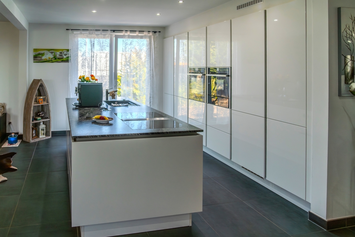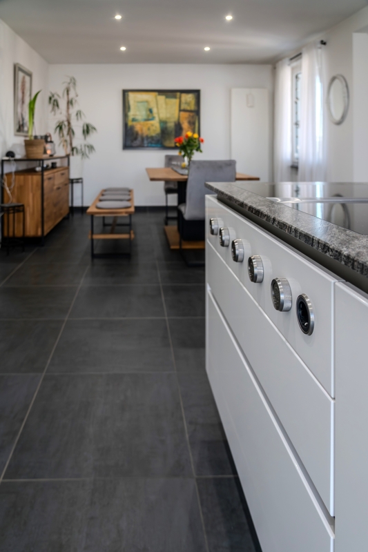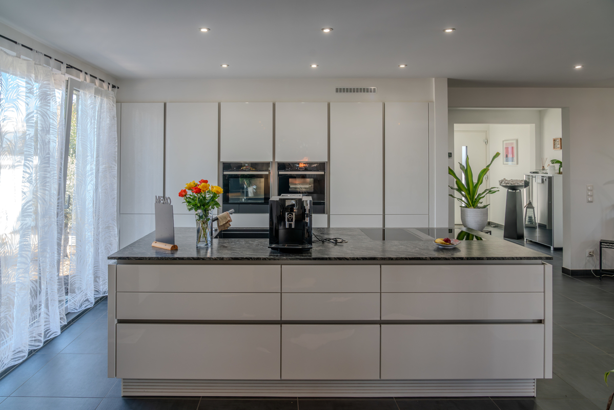 Die exklusive, offen gestaltete Küche mit ihrer großzügigen Kochinsel lädt zum gemeinsamen Kochen und Genießen ein. Hier trifft stilvolles Design auf höchste Funktionalität: Hochwertige Materialien, erstklassige Elektrogeräte und eine durchdachte Aufteilung machen diesen Raum zu einem Highlight für Hobbyköche und Genießer gleichermaßen.
