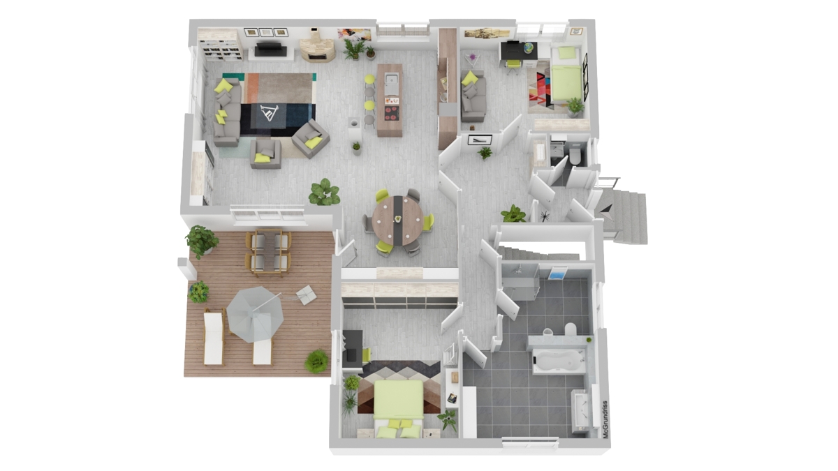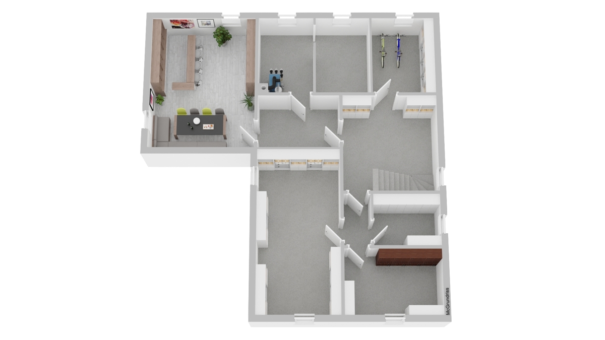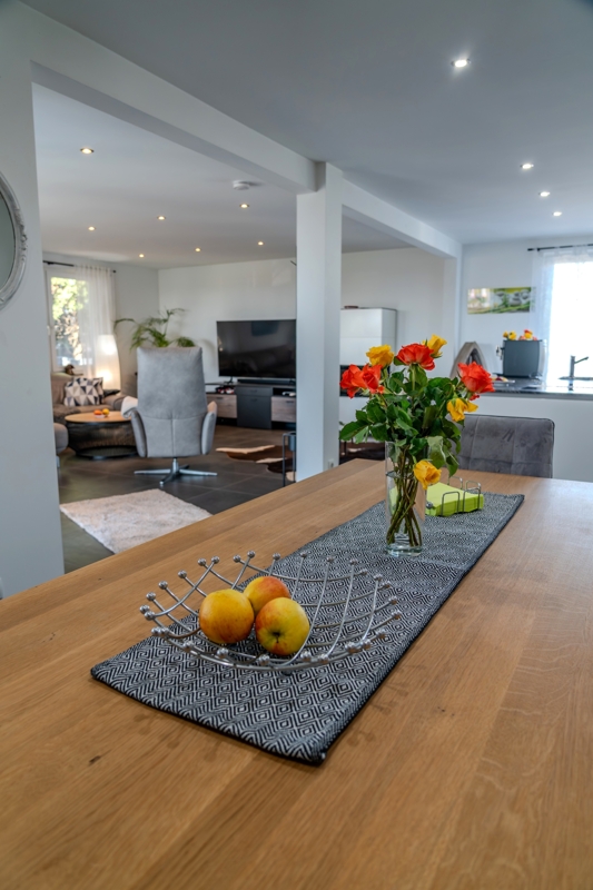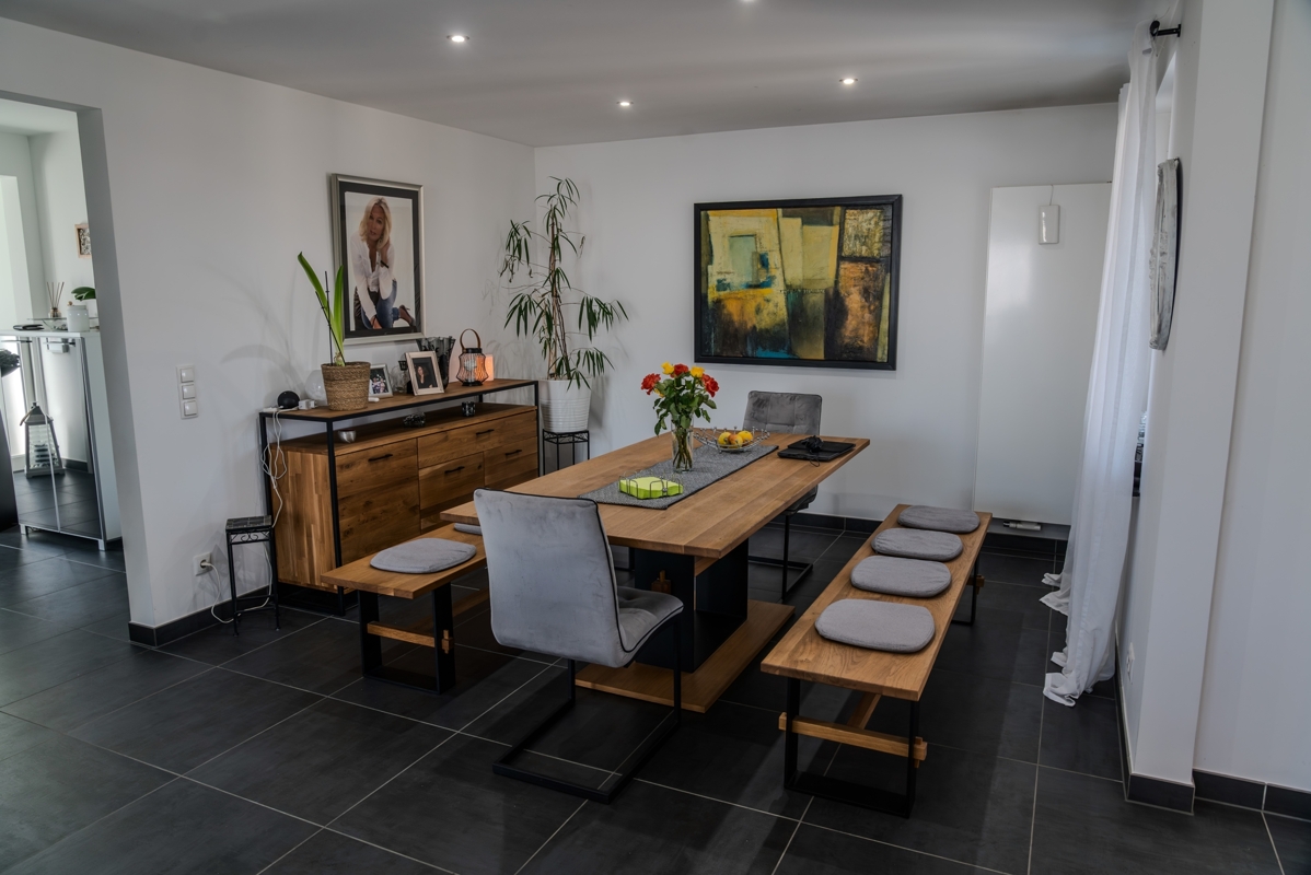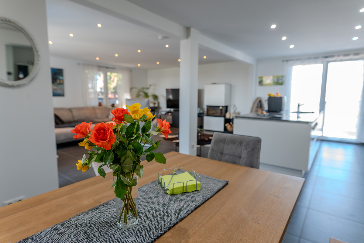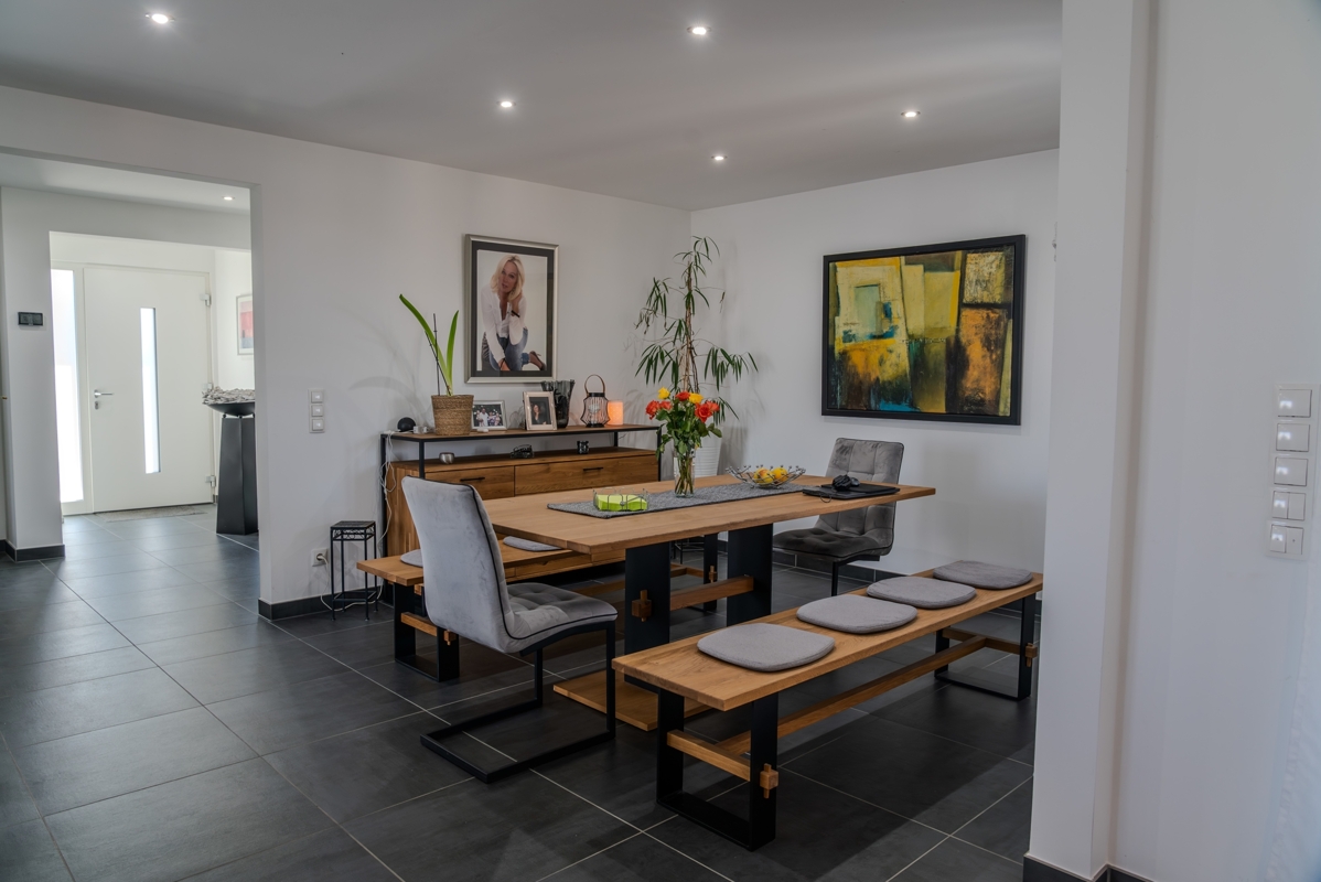 Schon beim Betreten spüren Sie die Großzügigkeit und Leichtigkeit, die dieses Haus ausstrahlt. Der offen gestaltete Wohnbereich verbindet fließend das Wohnzimmer, die Küche und den Essbereich zu einem harmonischen Ganzen. Große Fensterfronten lassen viel Tageslicht herein und schaffen eine helle, freundliche Atmosphäre. Von hier aus gelangen Sie direkt auf die weitläufige Terrasse – ein perfekter Ort, um den Tag bei einer Tasse Kaffee zu beginnen oder den Abend in entspannter Runde ausklingen zu lassen.