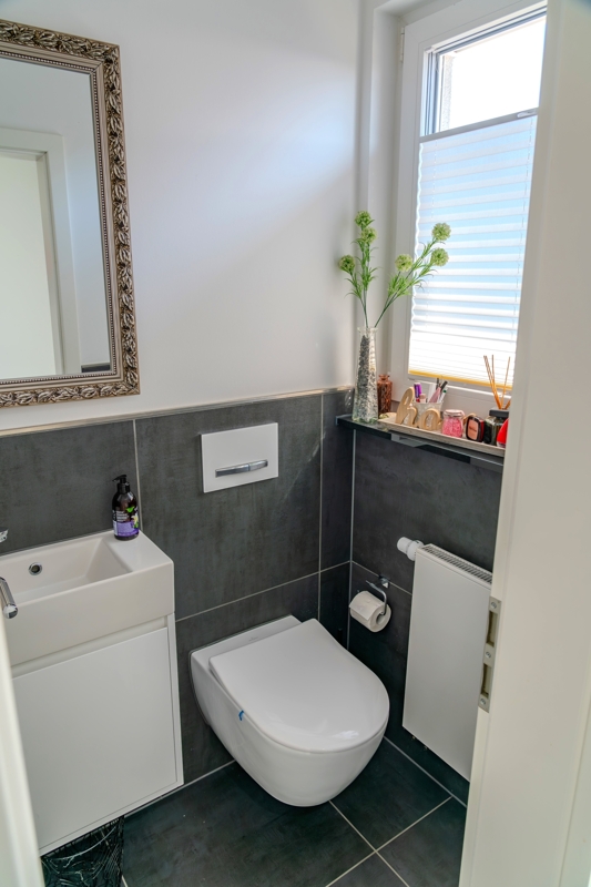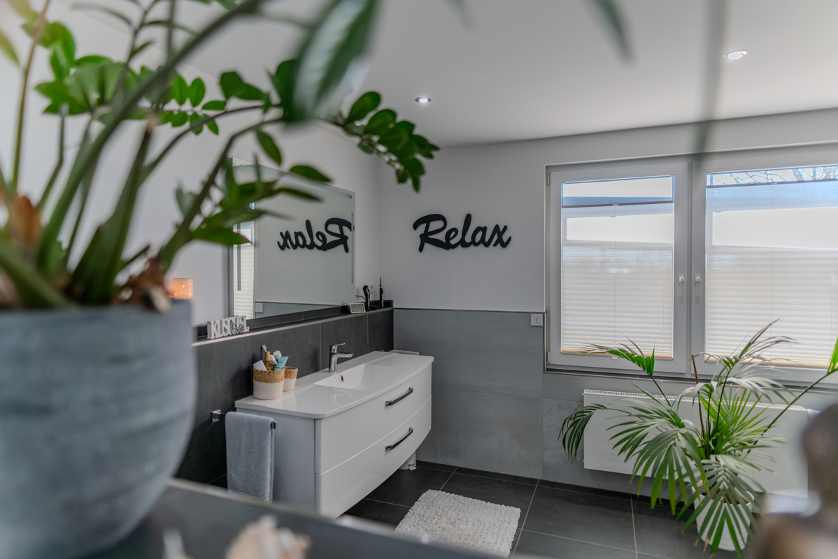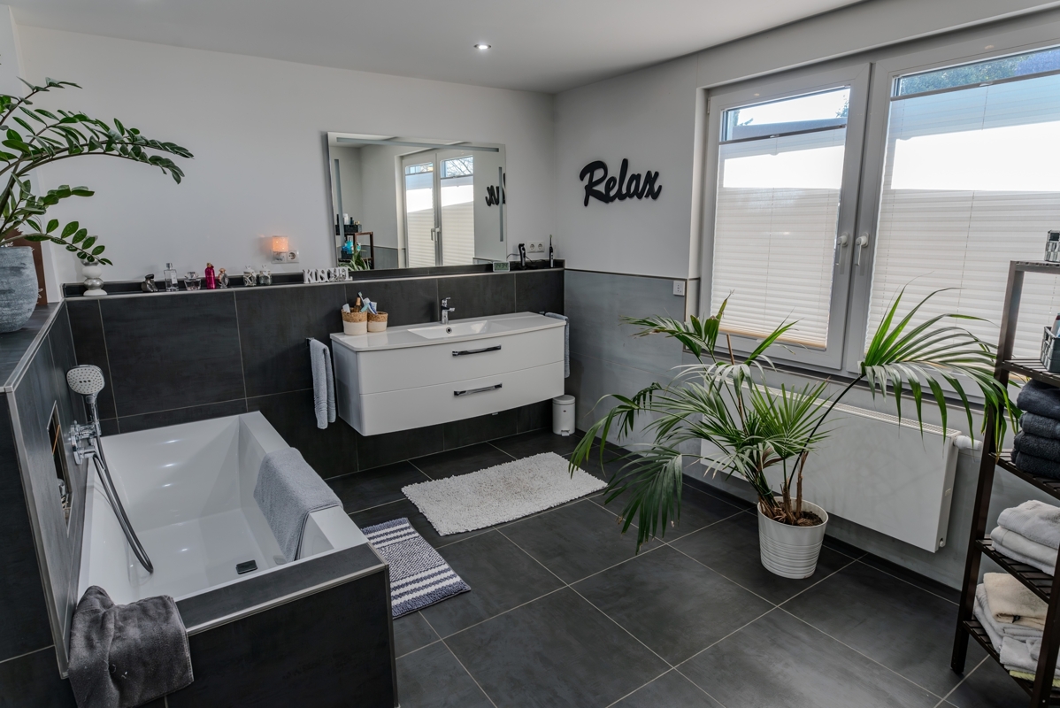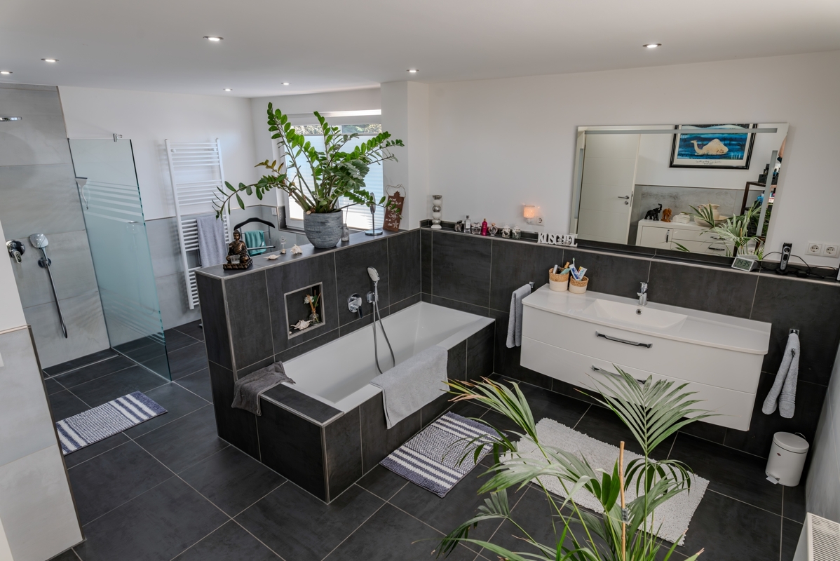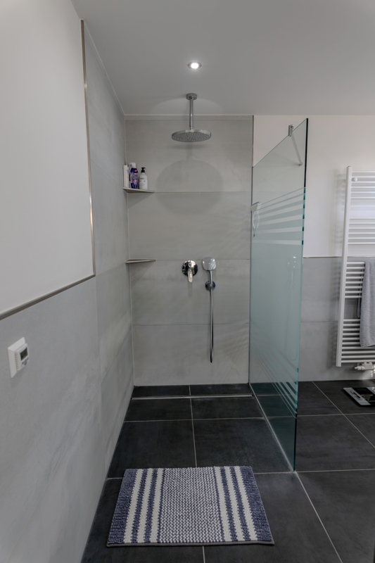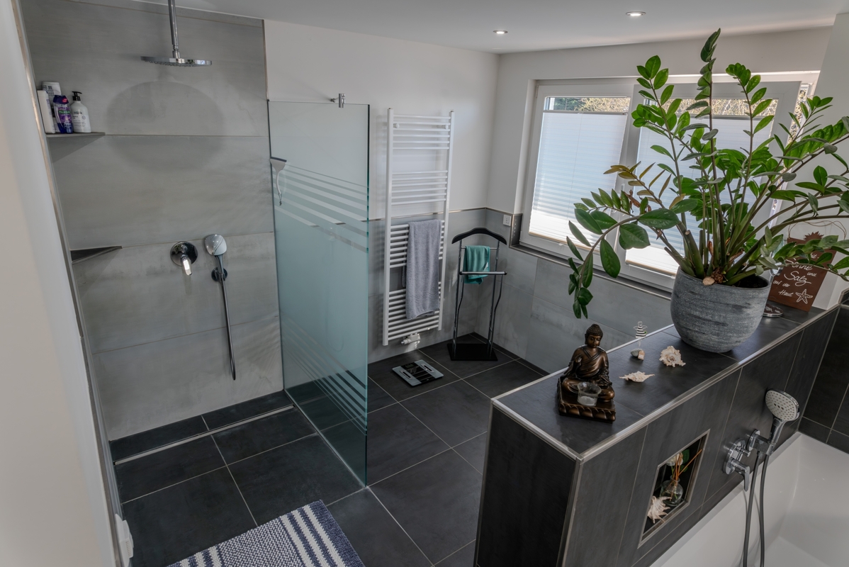 Das großzügige Badezimmer wurde mit viel Liebe zum Detail gestaltet und verbindet edles Design mit höchstem Komfort. Eine stilvolle Badewanne lädt zu entspannten Wellness-Momenten ein, während die bodenebene, großzügig verglaste Dusche mit einer luxuriösen Regendusche ein erfrischendes Spa-Erlebnis bietet. Hochwertige Armaturen, dezente LED-Beleuchtung und geschmackvolle Fliesen in schlichten Farbtönen schaffen eine Wohlfühlatmosphäre, die jeden Tag zu einem kleinen Verwöhnmoment macht.