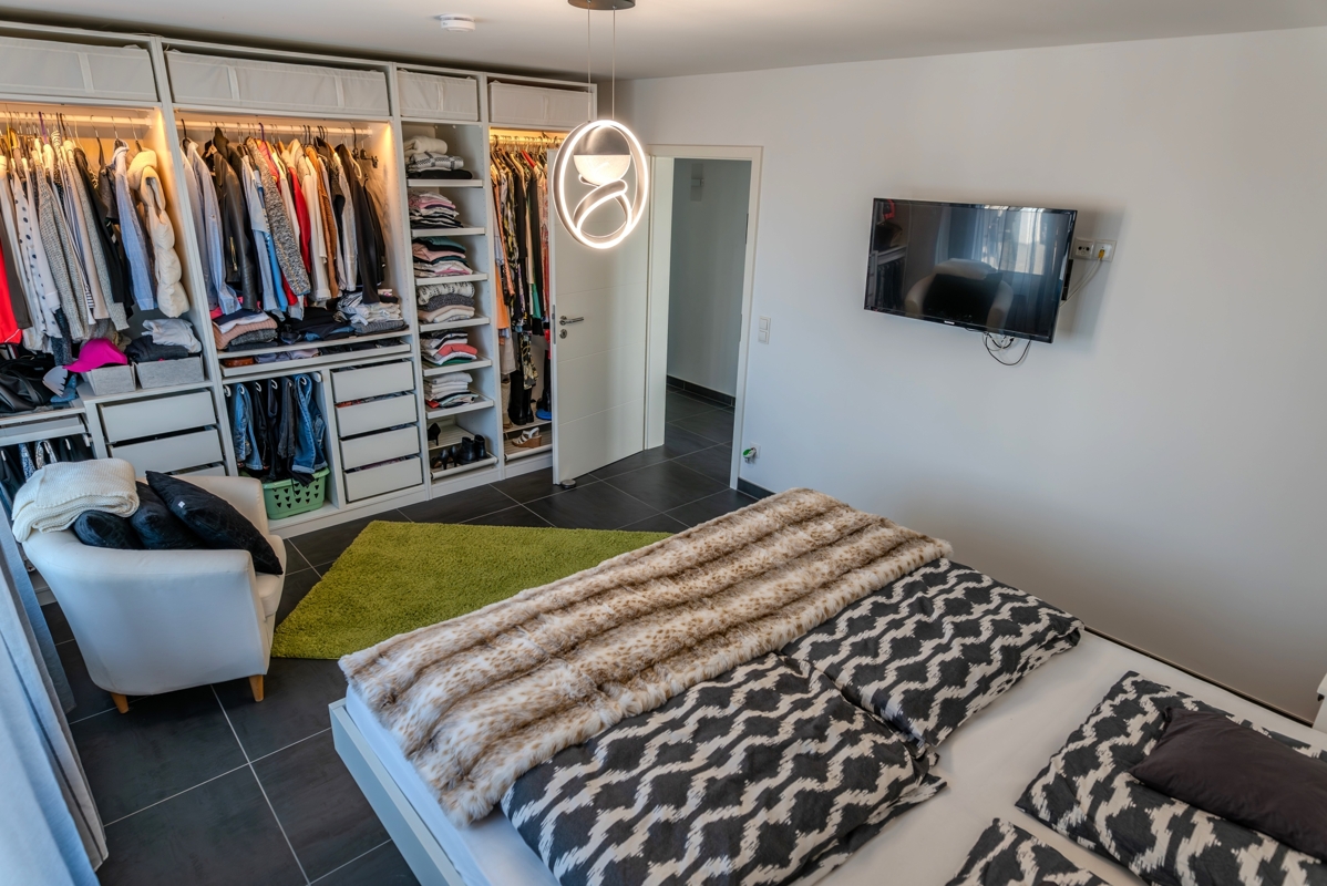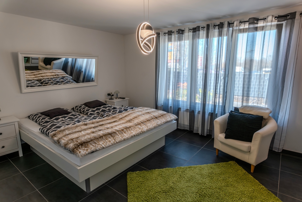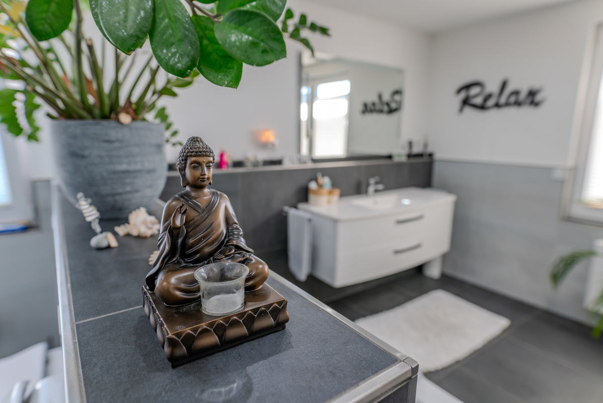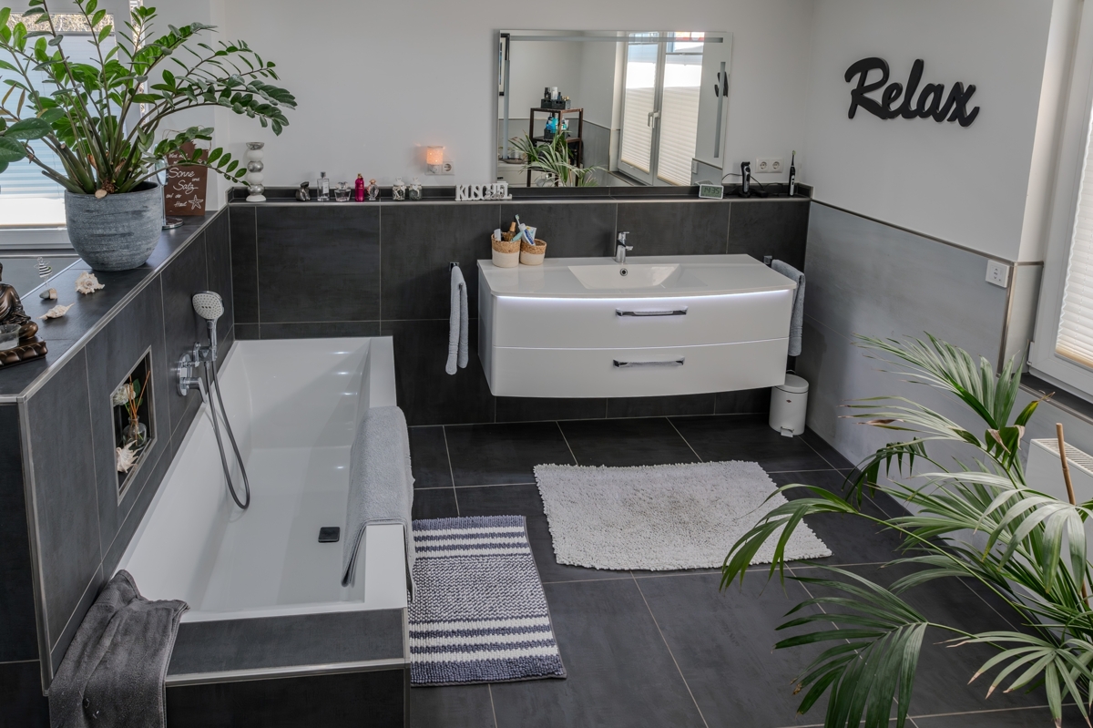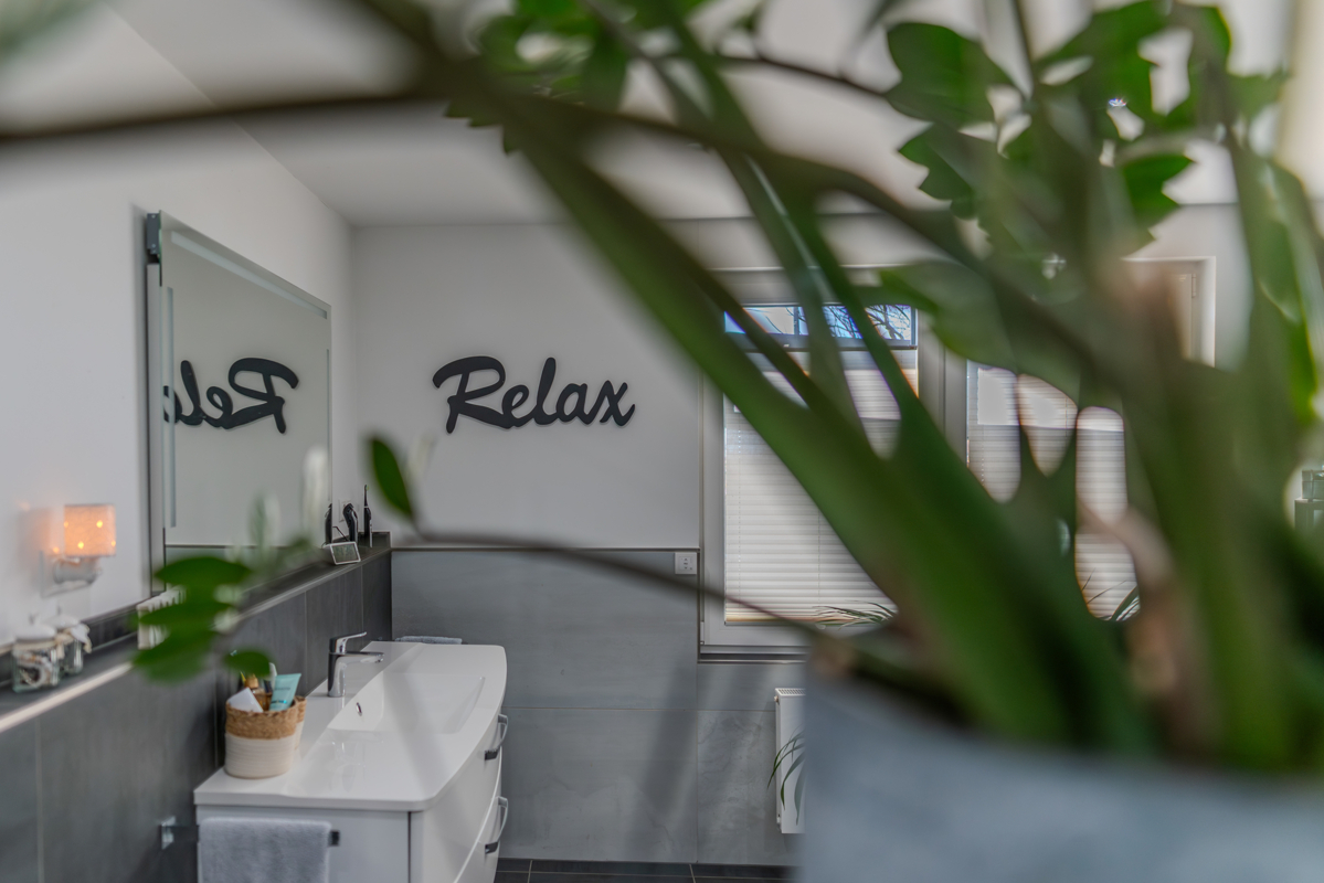 Das großzügige Badezimmer wurde mit viel Liebe zum Detail gestaltet und verbindet edles Design mit höchstem Komfort. Eine stilvolle Badewanne lädt zu entspannten Wellness-Momenten ein, während die bodenebene, großzügig verglaste Dusche mit einer luxuriösen Regendusche ein erfrischendes Spa-Erlebnis bietet. Hochwertige Armaturen, dezente LED-Beleuchtung und geschmackvolle Fliesen in schlichten Farbtönen schaffen eine Wohlfühlatmosphäre, die jeden Tag zu einem kleinen Verwöhnmoment macht.