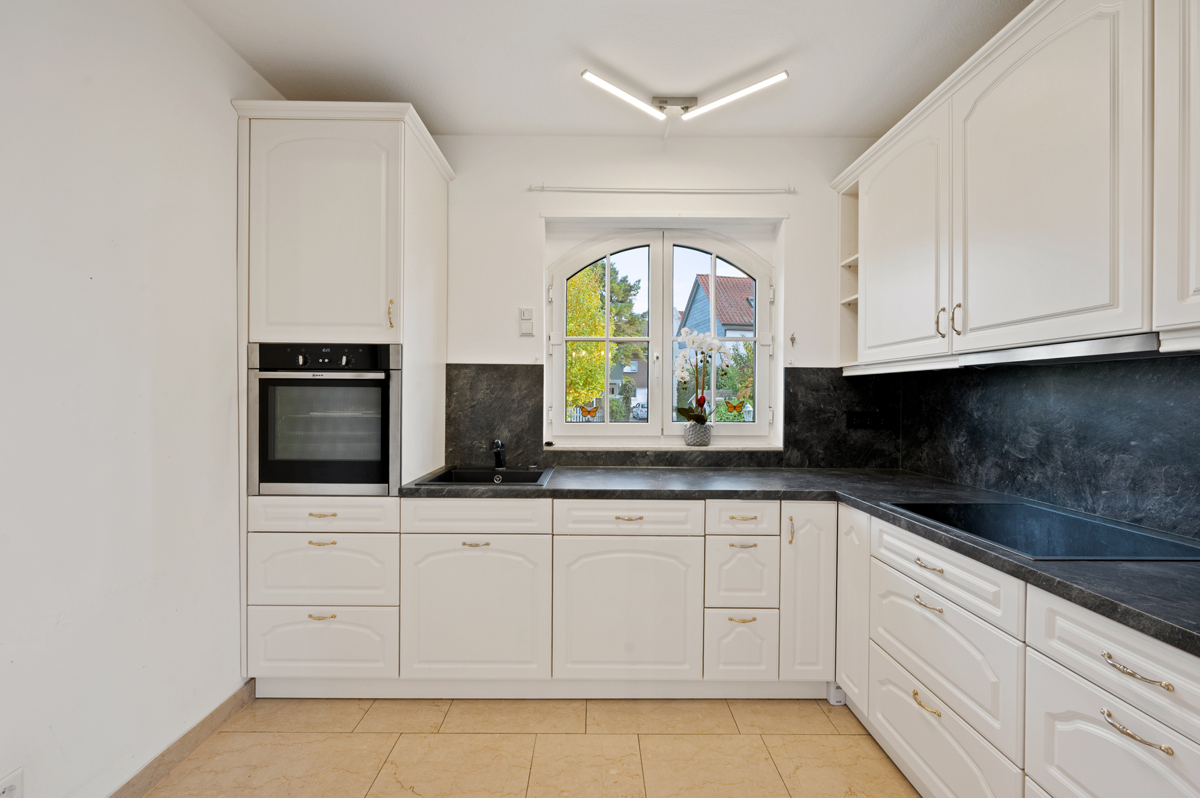 Im Erdgeschoss erwartet Sie ein praktischer Windfang mit Gäste-WC und Abstellkammer. Die offene Küche mit hochwertigen NEFF-Geräten ist direkt an den gemütlichen Essbereich angeschlossen. Das angrenzende, lichtdurchflutete Wohnzimmer begeistert mit großen Fenstern (1,877 m hoch) und einem herrlichen Blick ins Grüne. Von hier aus gelangen Sie direkt auf die Terrasse und in den Garten mit Abendsonne – ein wunderbarer Ort für entspannte Stunden im Freien.