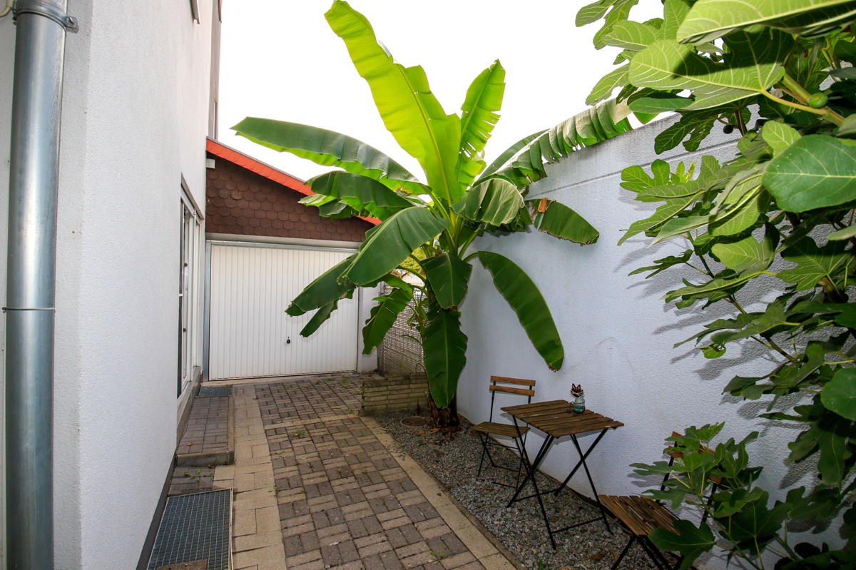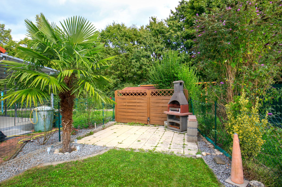 Der Garten wurde mit viel Liebe zum Detail gestaltet und besticht durch zwei Terrassen – eine davon überdacht direkt am Haus gelegen – sowie eine abwechslungsreiche Bepflanzung mit zwei Feigenbäumen, zwei Bananenstauden und einer Palme. Elektrische Stromanschlüsse sind vorhanden und abschließbar. Eine integrierte Sprinkleranlage erleichtert die Pflege der Grünflächen, während ein fest installierter Kohlegrill auf der offenen Terrasse zu geselligen Stunden im Freien einlädt.