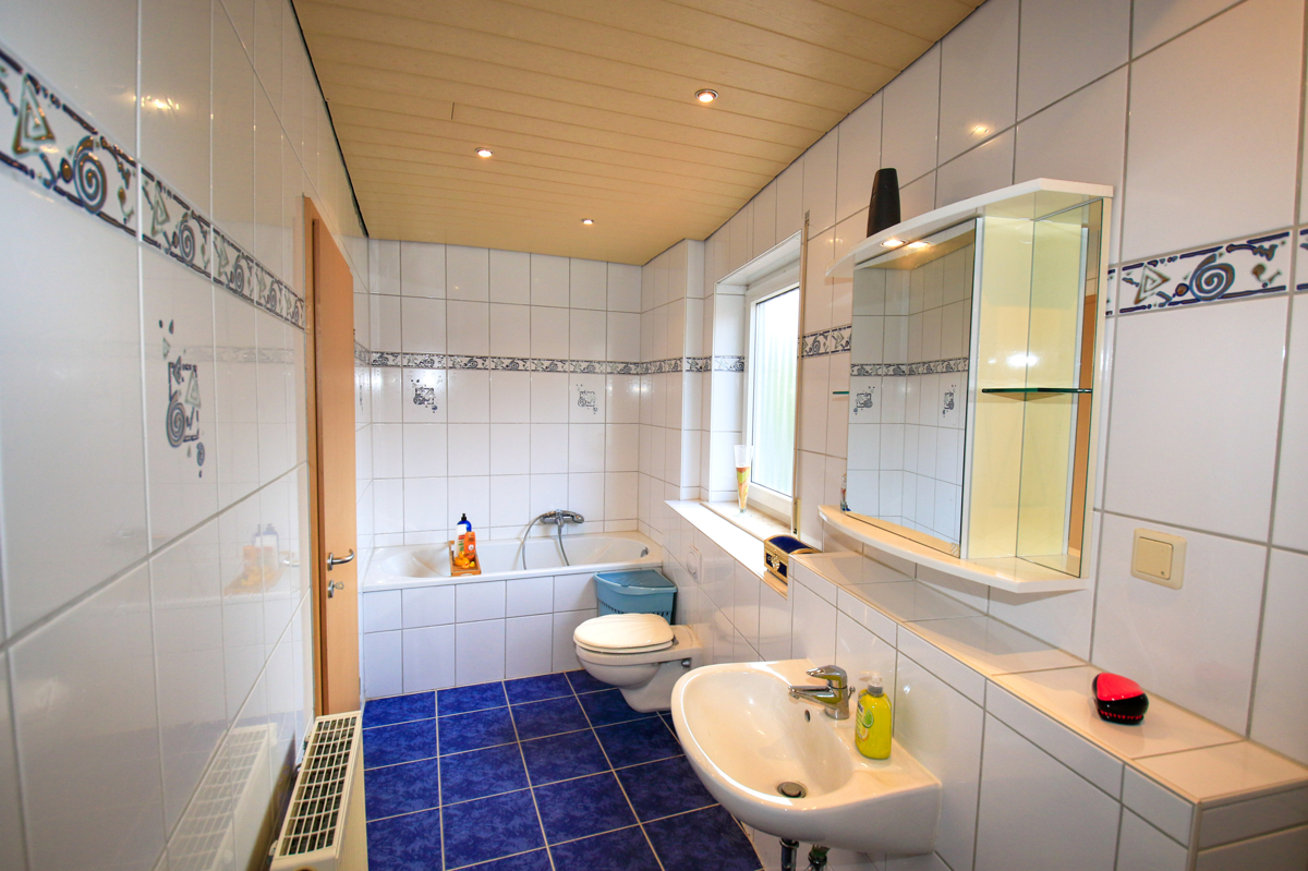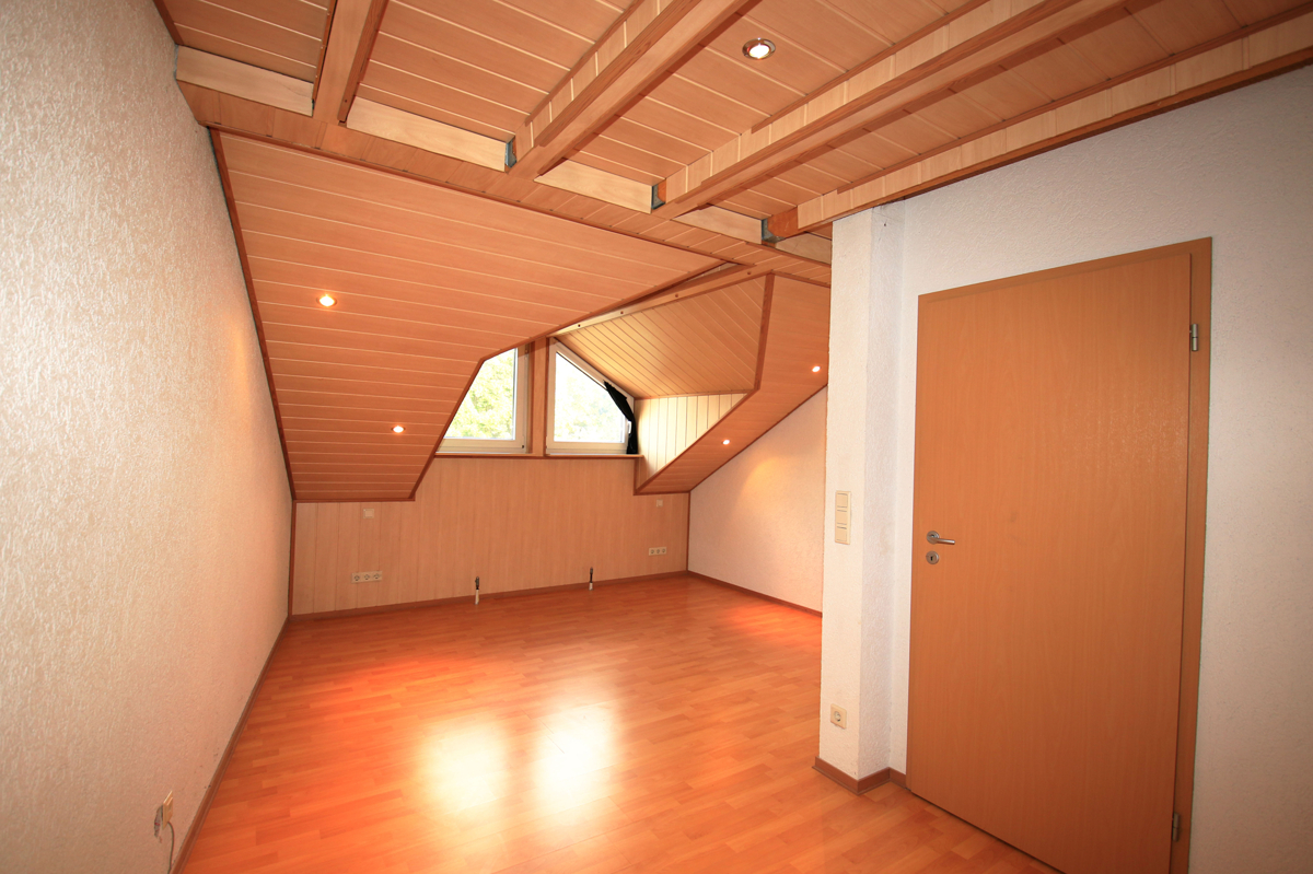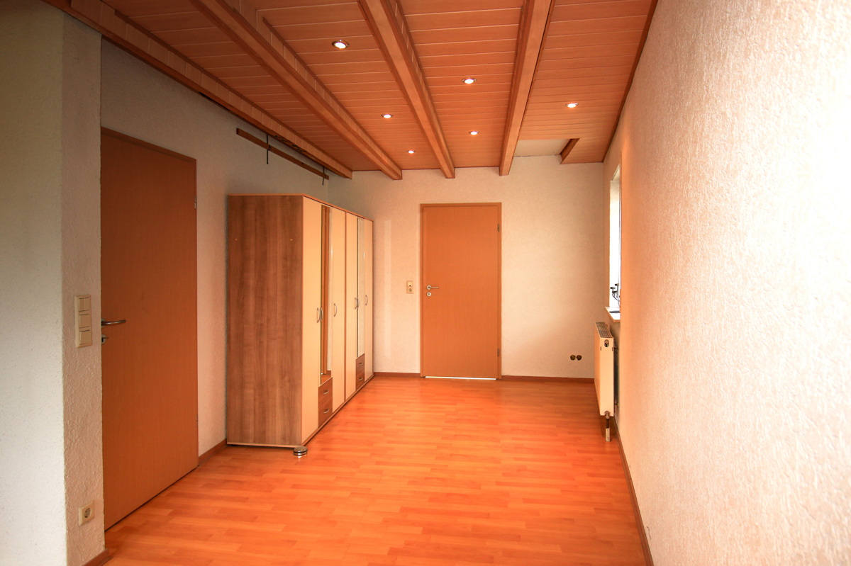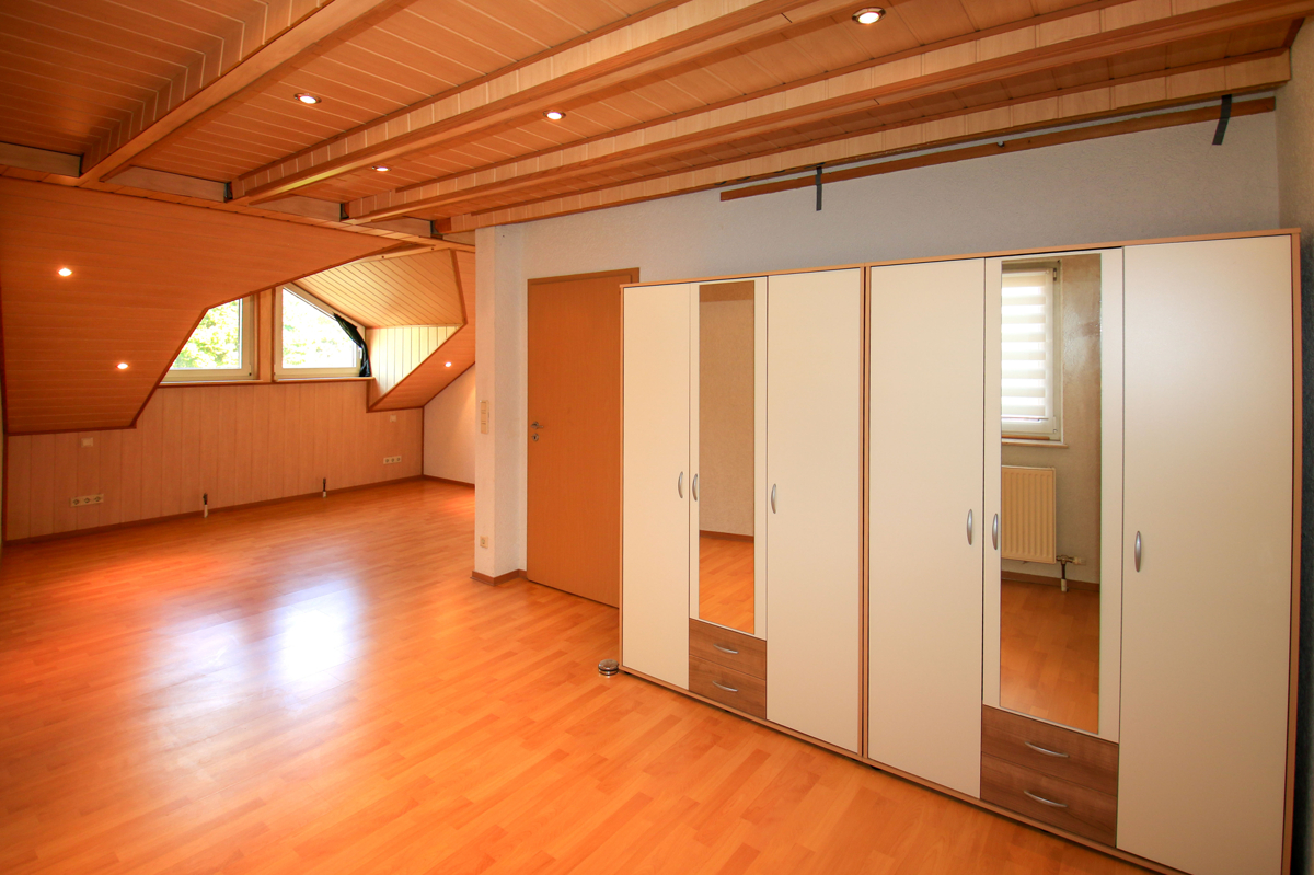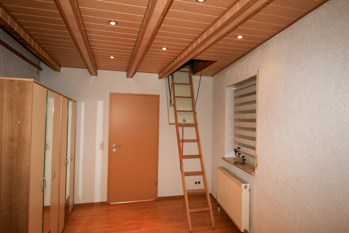 Im Obergeschoss erwarten Sie zwei gut geschnittene Schlafzimmer mit Laminatboden sowie ein großzügiges Tageslichtbadezimmer, das mit Badewanne, Dusche und WC ausgestattet ist. Holzdecken verleihen dem Raum eine gemütliche Atmosphäre.